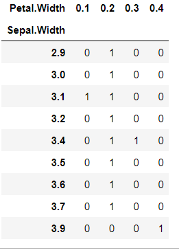 1) crosstab - To make frequency tableimport pandas as pd df = pd.read_csv('iris.csv') pd.crosstab(df.loc[:10, 'Sepal.Width'], df.loc[:10, 'Petal.Width'])2) isna() isna() is the same with isnull() In reverse, notna() is the same with notnull() 3) fillna() To handle nan value easily, fillna() is used.Signature: df.fillna(value=None, method=None, axis=None, inplace=False, limit=None, downcast=None,..